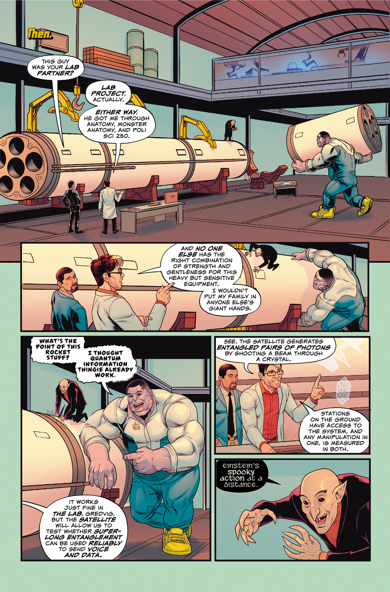 After the pages are colored, we turn things over to Marco. Lettering needs to be subtle yet clear and obvious all at the same time, and Marco has just the right touch. Working with him is a true delight. He’s a real craftsman: consistent, thorough, and patient. He also has a flair for design and makes energetic sound effects just right for the action. And then, finally, he pulls everything together for us on the production side: credit pages, back covers, and all the file prep. We’re fortunate to work with such a talented artisan.