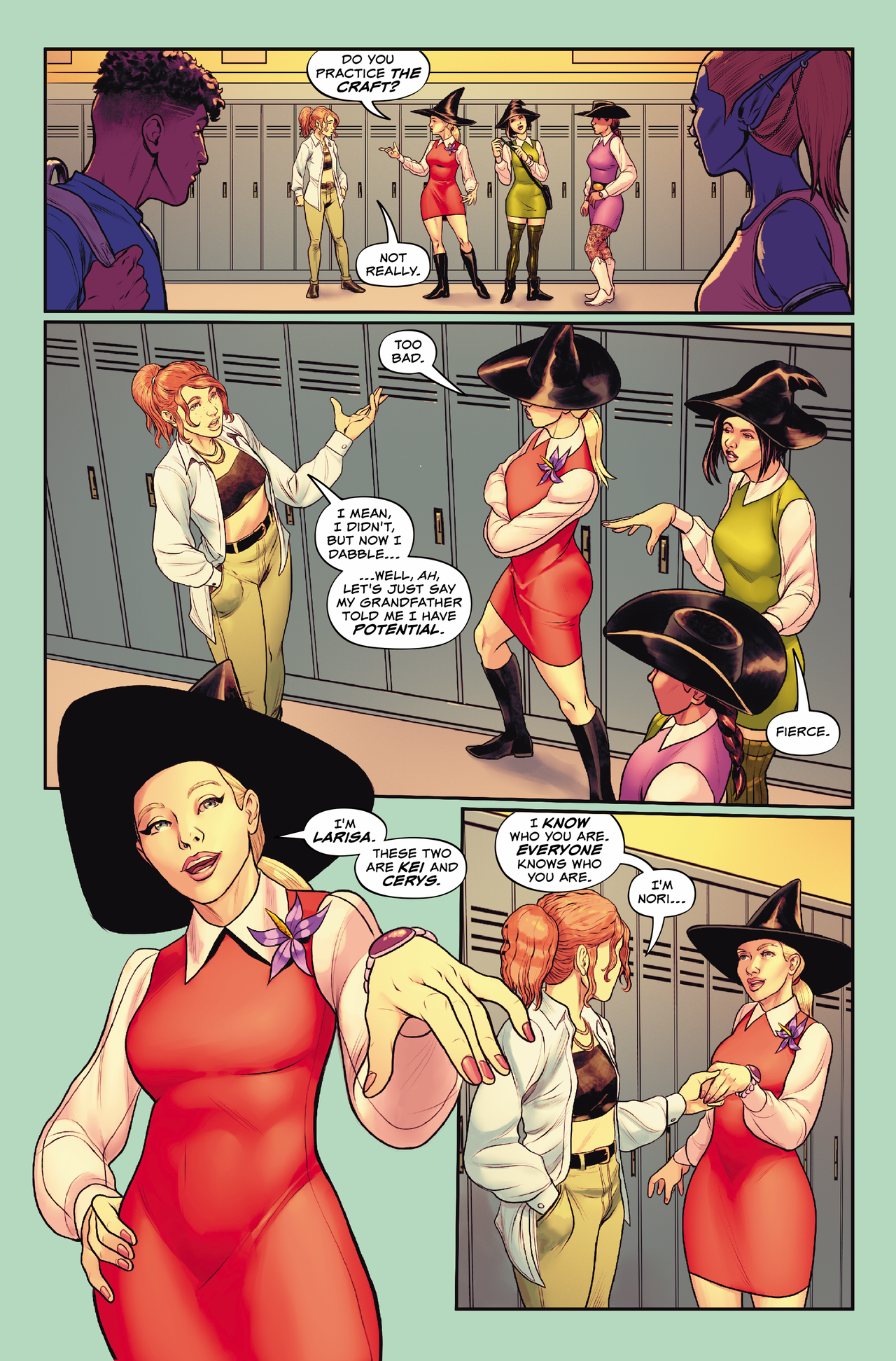 In the first mini-series, we explored the idea of destiny and choice and identity when the werewolf dad and mad scientist, Phil, discovered a set of magical mirrors and the dark power they contained. When Phil realized that his own estranged father, Gustav, was using the mirrors to feed off the space-time continuum, our mixed-up family of monsters pursued Gustav across dimensions to save the very fabric of reality. Although divided by worlds and personal conflicts, the family was able to hold together long enough to keep reality from falling apart. But during all that, Gustav used one of the mirrors to show Nori a possible future self—a dark destiny. We pick up that thread in the new series, where Nori’s going to meet some witchy girls who promise to help her discover her true self.